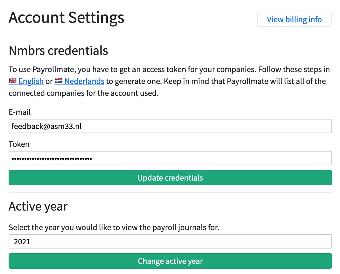 You have to save your Nmbrs API access tokens in your Payrollmate account settings. Follow these steps in 🇬🇧 English or 🇳🇱 Nederlands to generate one. Keep in mind that Payrollmate will list all of the connected companies for the account used.