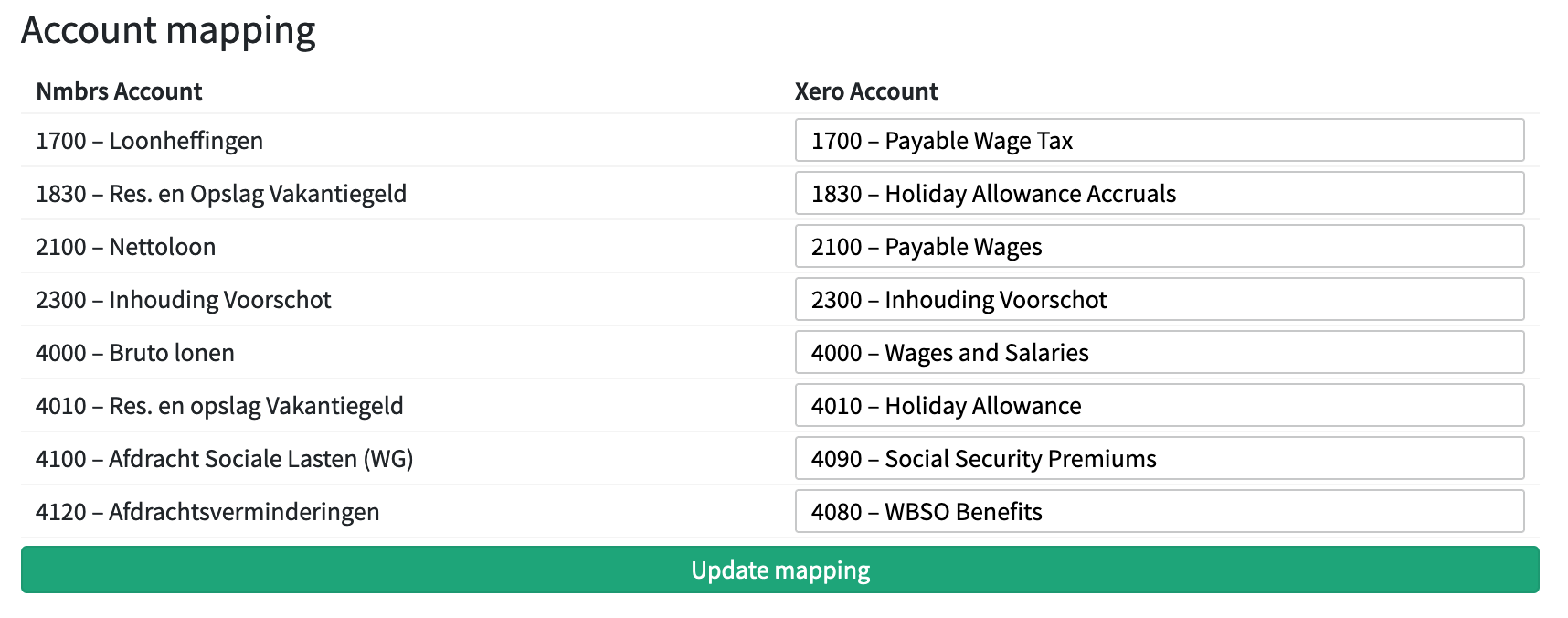 After you have connected to Xero, go to the company settings of the organisation you would like map the accounts of. On the left side are the accounts which have been used by the Nmbrs journals, and on the right side are the accounts pulled from Xero. Select the correct accounts and update the mapping.