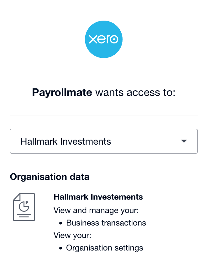 Payrollmate requires two permissions: View and manage your business transactions (to push journals), and view your organisation settings (to request chart of accounts details).