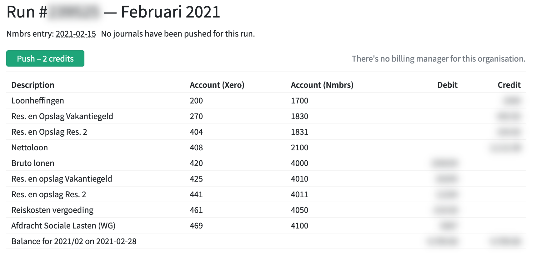 For pushing journal entries to Xero, Payrollmate condenses the Nmbrs payroll journals (removing empty lines, combining lines on the same accounts, and taking the differences of credit and debit sides) and sends them directly to the Xero organisations. Additional metadata (the ID of the journal that has been created, and the date of creation) is stored after the journals are pushed to Xero.